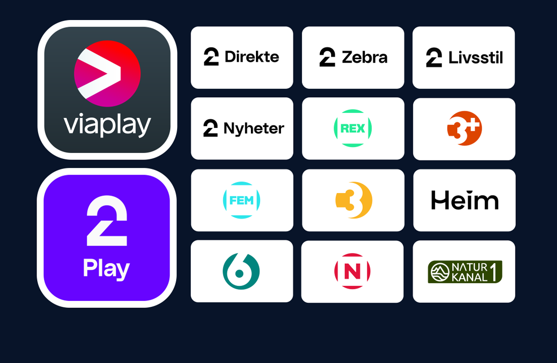 Her får du 12 populære norske TV-kanaler, samt tilgang til TV 2 Play (med reklame) og Viaplay Film og serier.